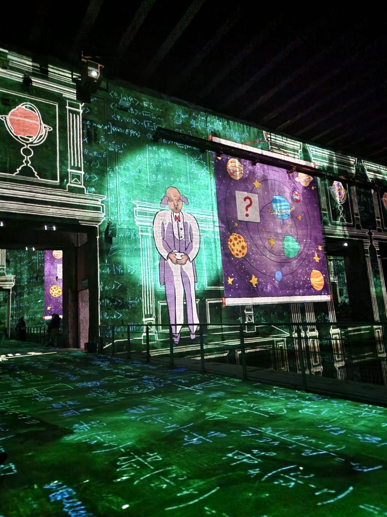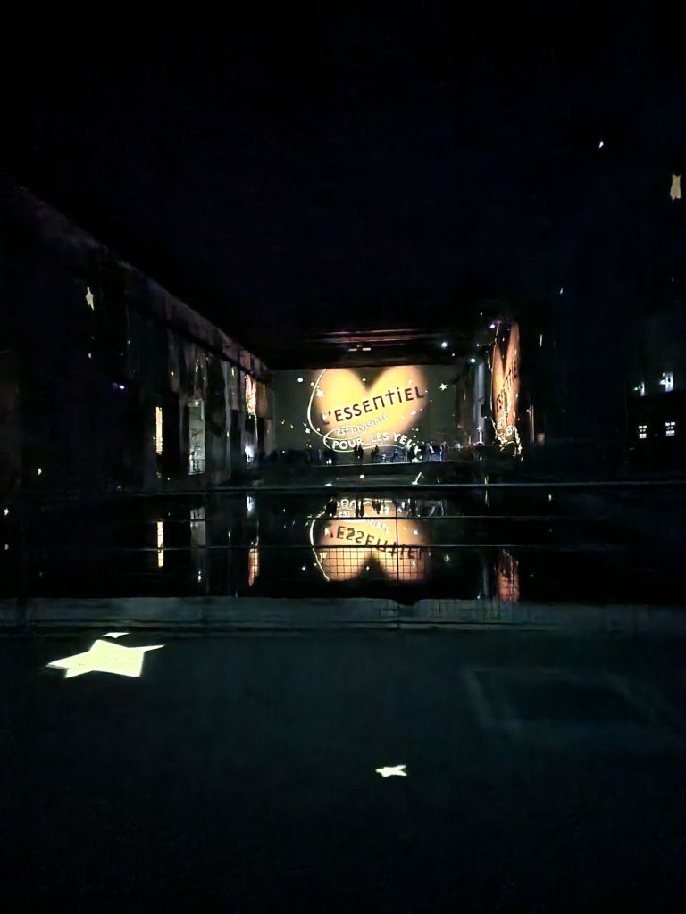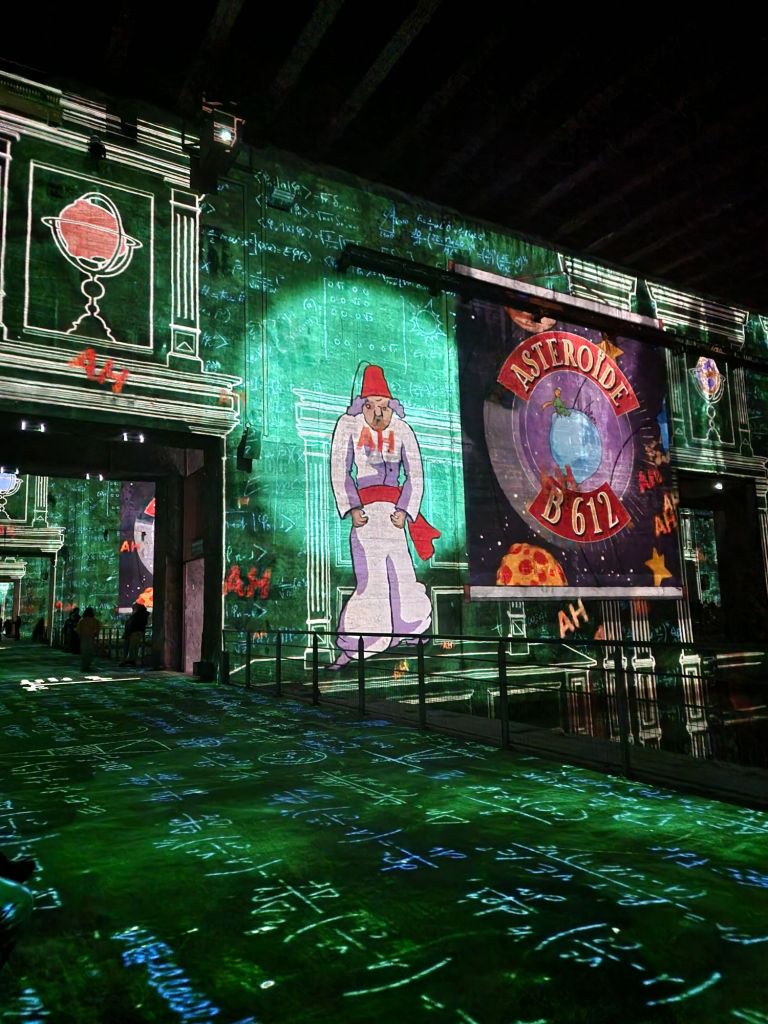 Dès les premiers pas dans les anciens bassins, le visiteur est enveloppé par une ambiance féérique. Les murs, les sols, les colonnes… tout est animé par des projections lumineuses qui donnent vie aux aquarelles et aux mots de Saint-Exupéry. On se sent tout petit face à l’immensité de ces paysages célestes, transporté dans un univers où l’imaginaire n’a pas de limites.