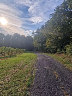 Le parcours alterne entre chemins forestiers, sentiers bordés de haies, et routes serpentant au milieu des vignes. Ici, le temps semble suspendu. Le chant des oiseaux, le bruissement des feuilles, et les panoramas ouverts sur les collines de Saintonge invitent à la contemplation.